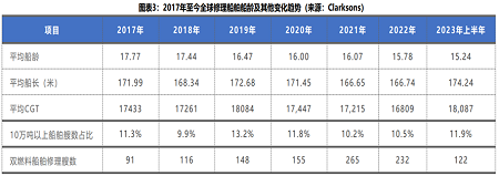 從2017年到2023年,20年及以上船齡的船舶占比由32%下降到25.7%;15-19年船齡的船舶修理由23%下降到22%;10-14年船齡船舶修理由34%下降到29%;而10年以下船齡的船舶修理占比則由10%上升到23%。隨著全球環(huán)保法規(guī)的增加,老舊船舶的淘汰將逐漸增多,修船船齡將持續(xù)呈年輕化趨勢發(fā)展。從統(tǒng)計數(shù)據(jù)來看,全球修船平均船齡已經(jīng)由2017年的17.77年下降到2023年的15.24年。