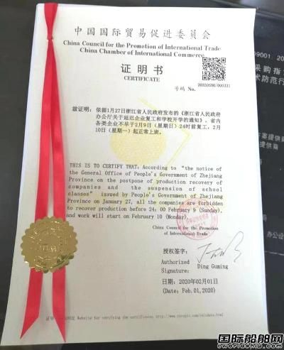 圖:2月2日上午,中國貿促會向浙江湖州某汽配制造企業出具全國首份新型冠狀病毒肺炎疫情不可抗力事實性證明書。