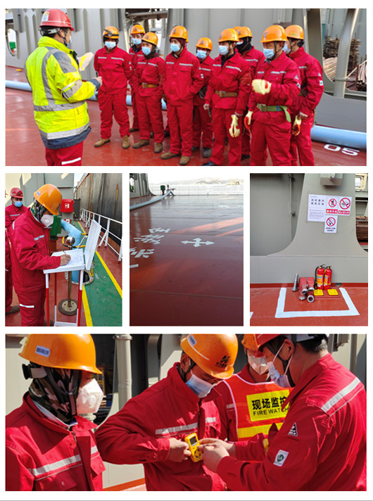 該船進廠時燃料罐內剩余300立方的天然氣主機燃料,公司對該艙室LNG罐體周圍相連管路系統(tǒng)按要求進行惰封處理,艙內保持全天候不間斷監(jiān)測,確保測氧測爆合格。所有施工人員上船前進行了專業(yè)安全培訓,按要求穿戴防靜電服,并執(zhí)行嚴格的施工程序。船上危險作業(yè)點等均設專職安全監(jiān)護員,另外,重點加強了對液貨艙的安全防護,艙內所有腳手架均按特涂腳手架標準搭設和檢驗。