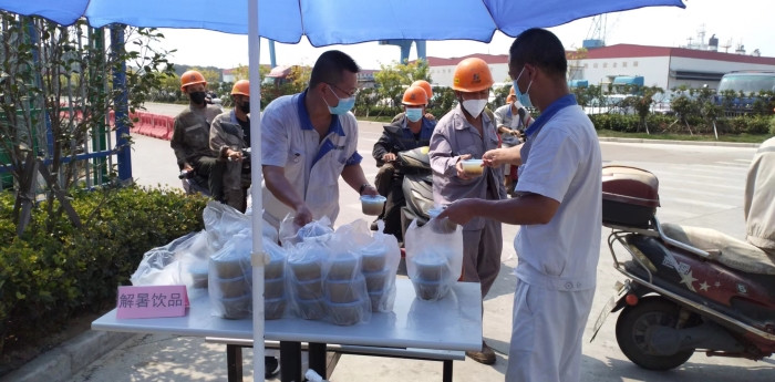 7月以來,持續的高溫天氣,考驗了船廠的修造工人,公司除了調整作息時間,避開高溫時段;生產現場增加高溫生產安全防護外,經相關部門商議,決定不定期向工人們送防暑降溫冷飲,送發地點安排在員工寢室樓兩個通道出口處。